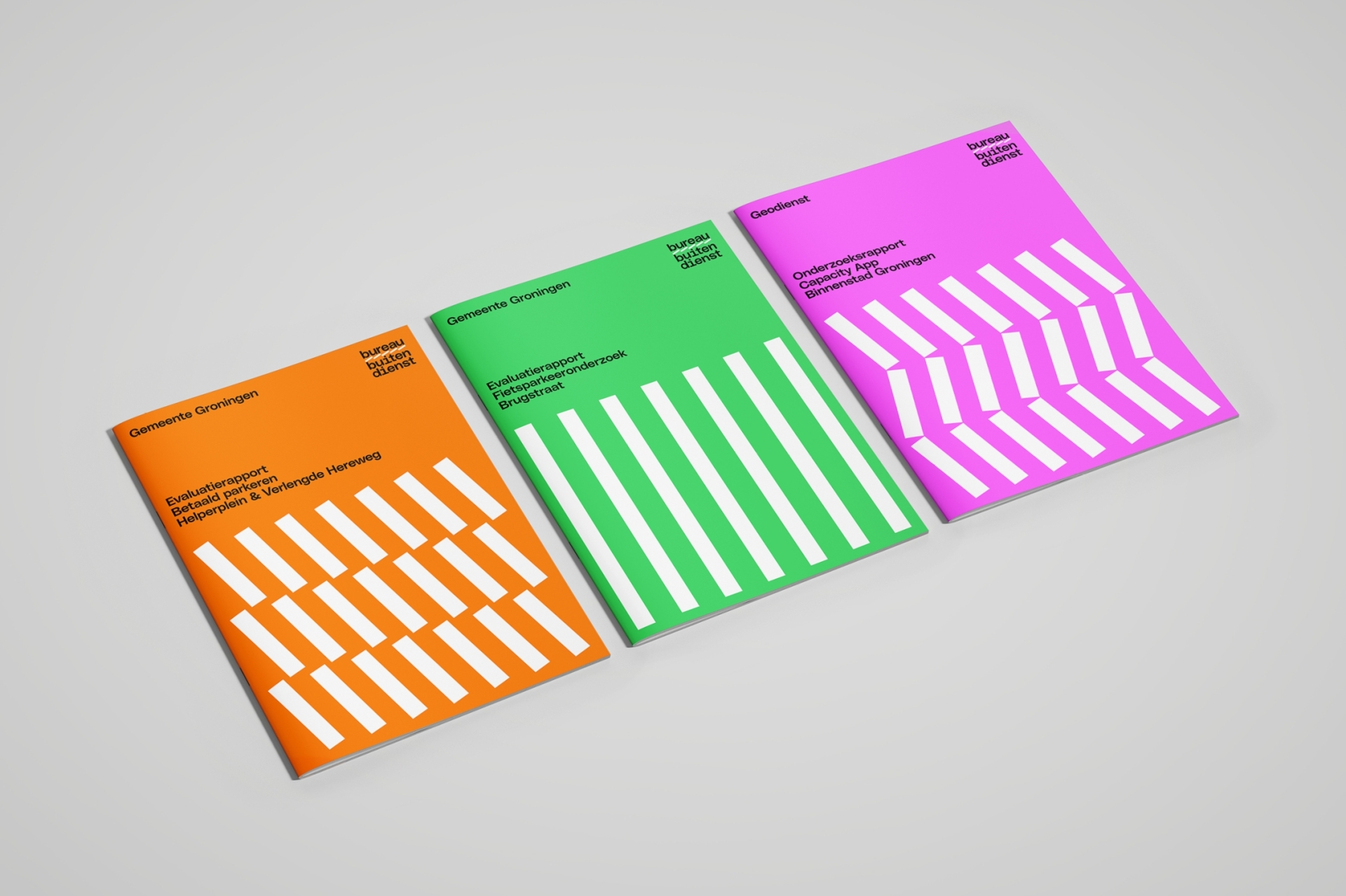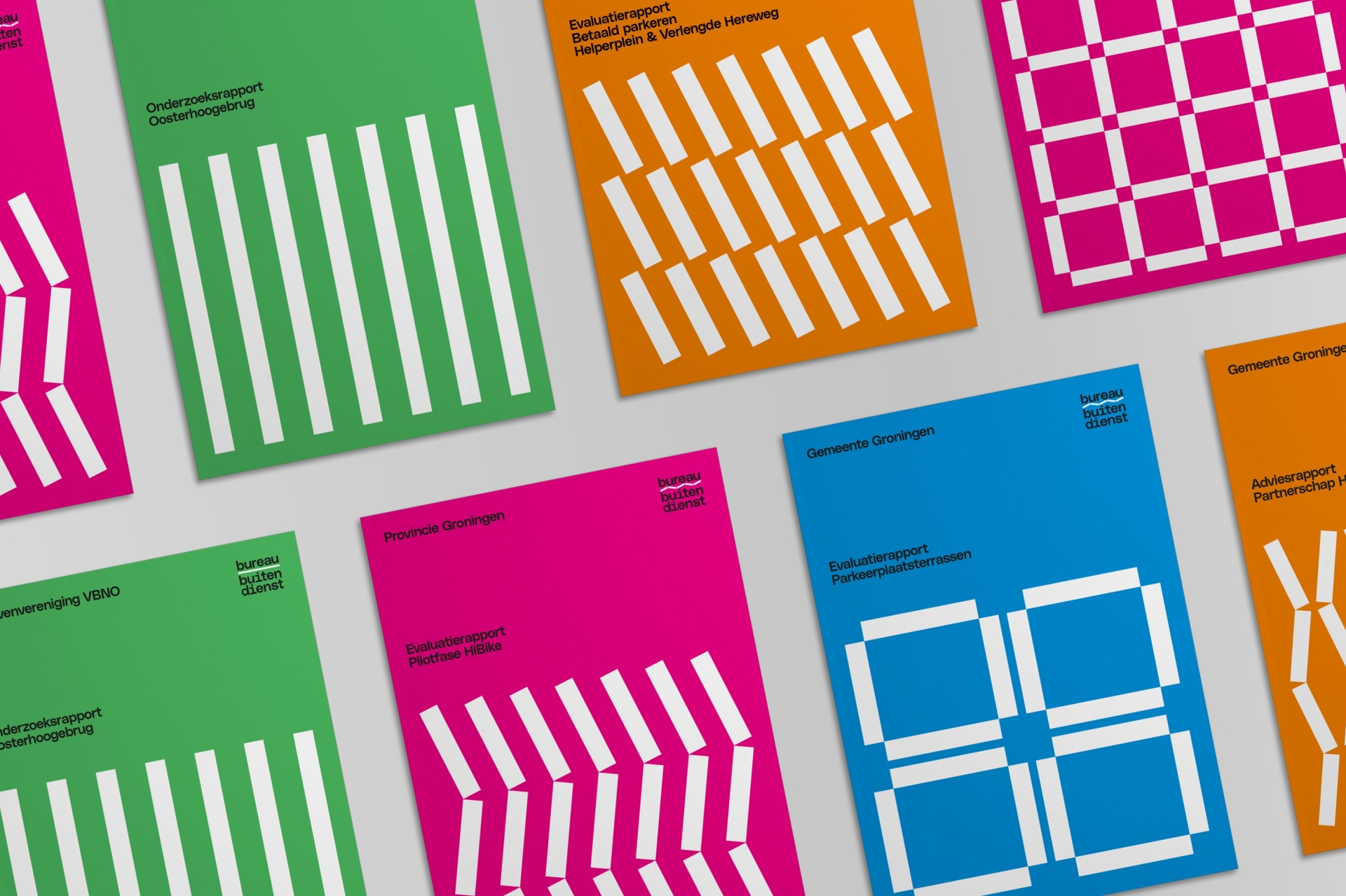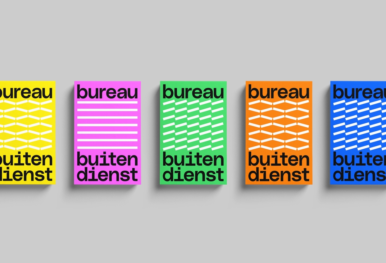 The identity of Bureau Buitendienst visualizes this idea. Straightforward typography highlights the rational side of their approach, colorful shapes the creative side. It results in a dynamic logo-system that can take various forms, yet stays distinct and recognizable.