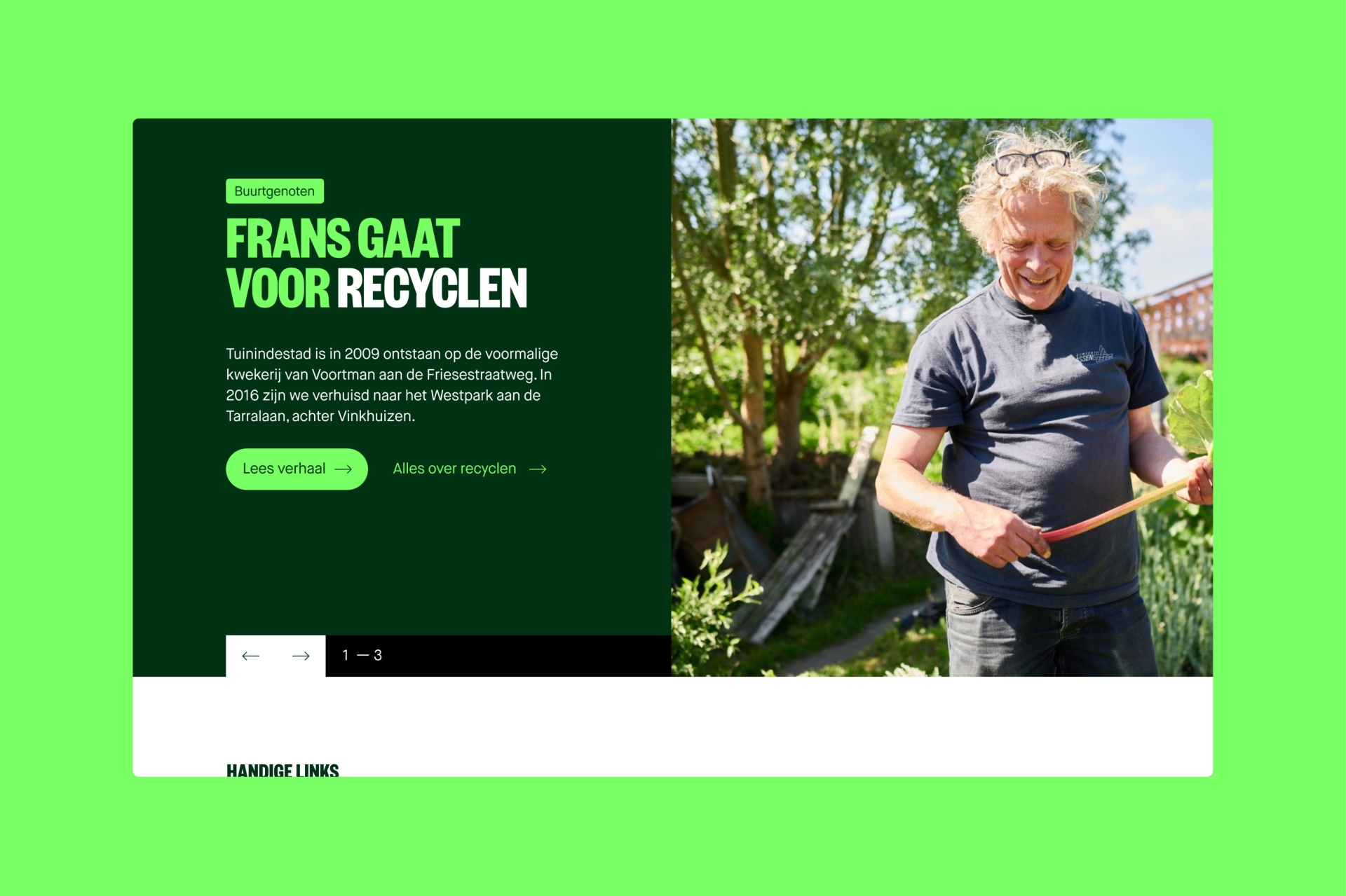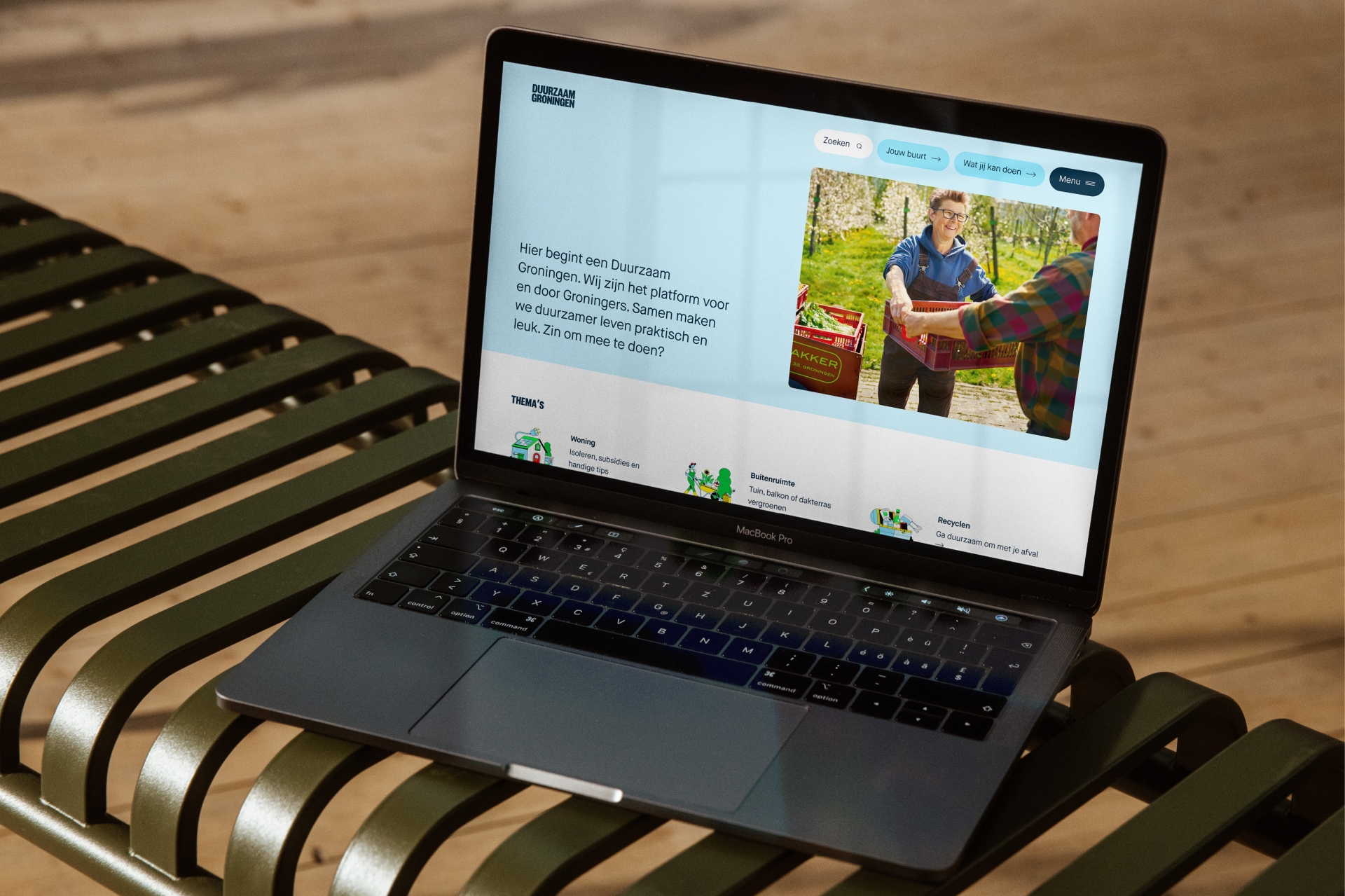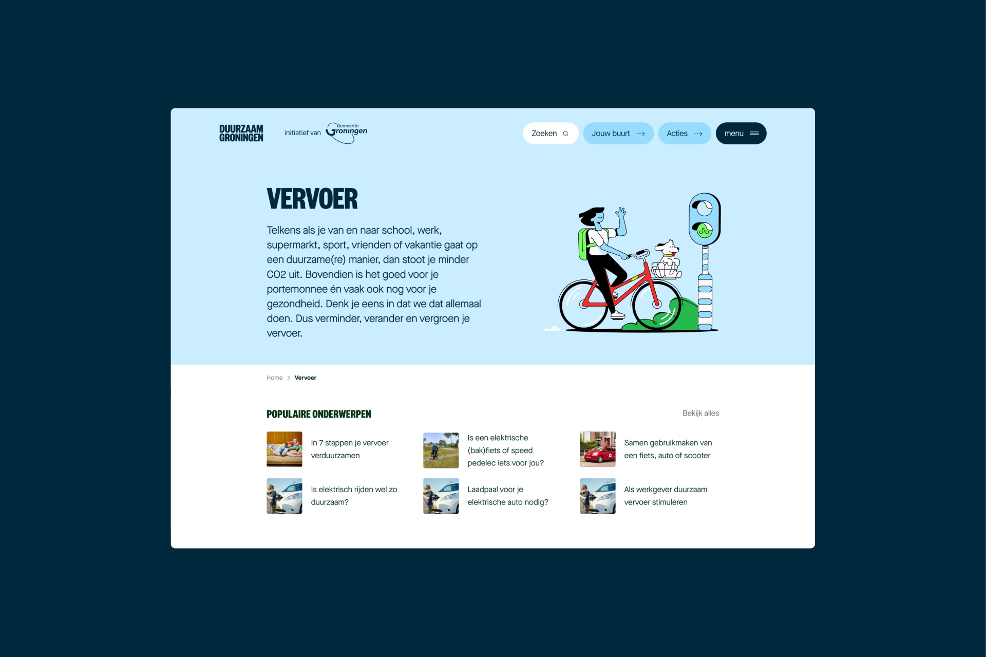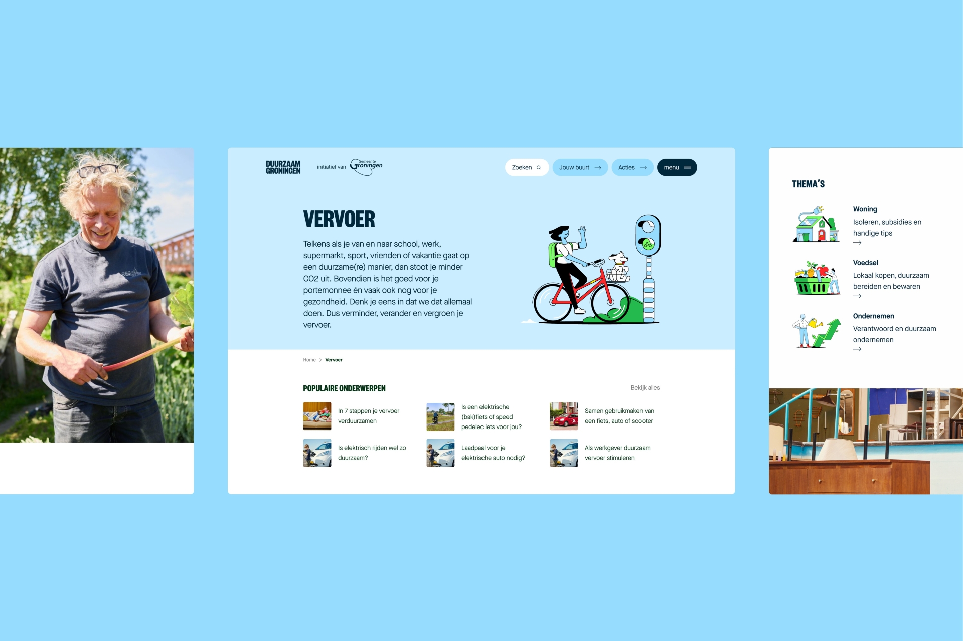 One portal for all things sustainable, for all inhabitants of Groningen (municipality). What used to be a number of single-subject sites has now been combined into one logical online space. To find government info, neighborhood initiatives and personal inspiration on how to ecologically deal with topics such as energy, food, garden, home, waste, travel or business. The launch of the portal was backed by a campaign to create awareness and recognizability.