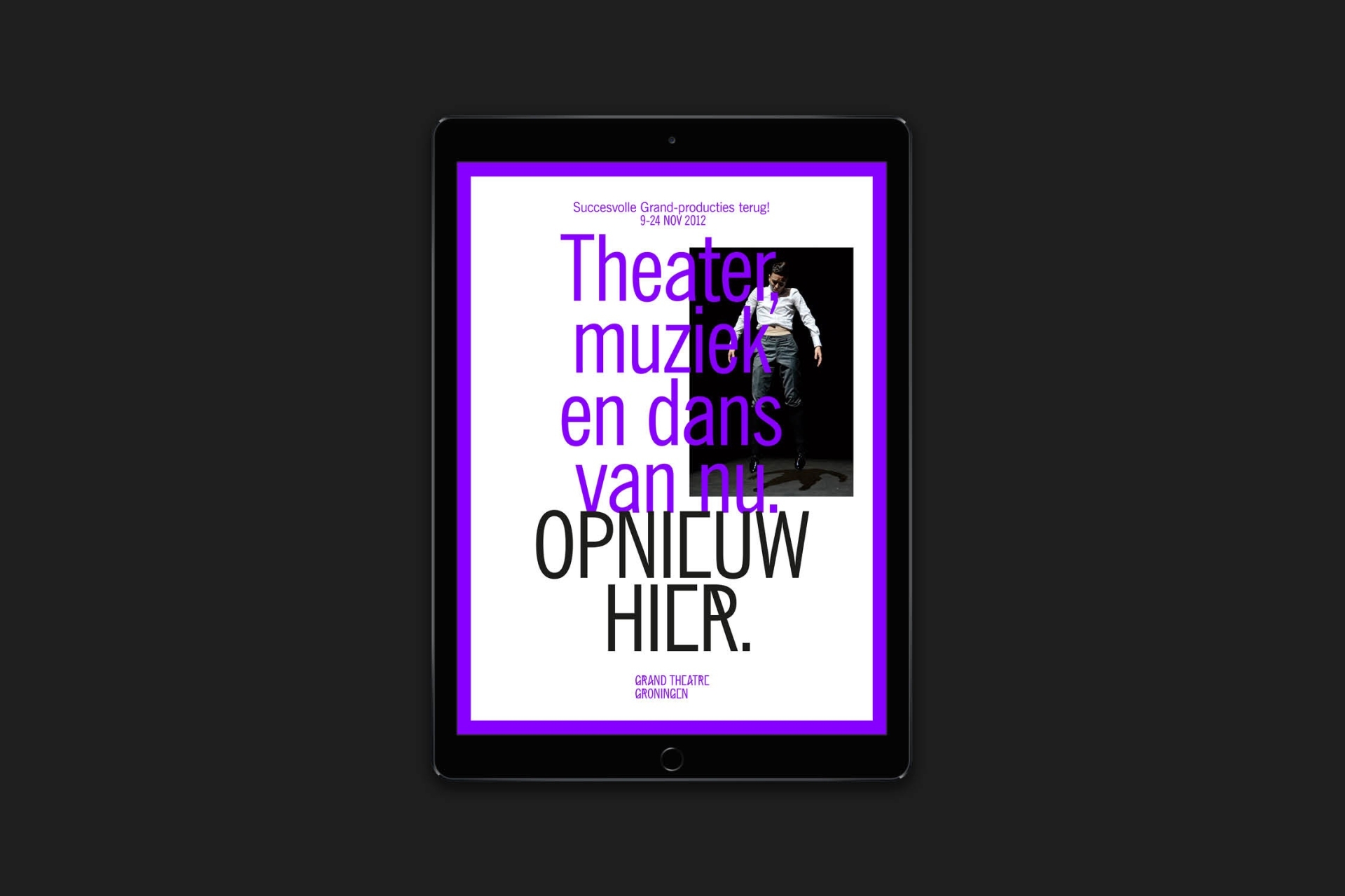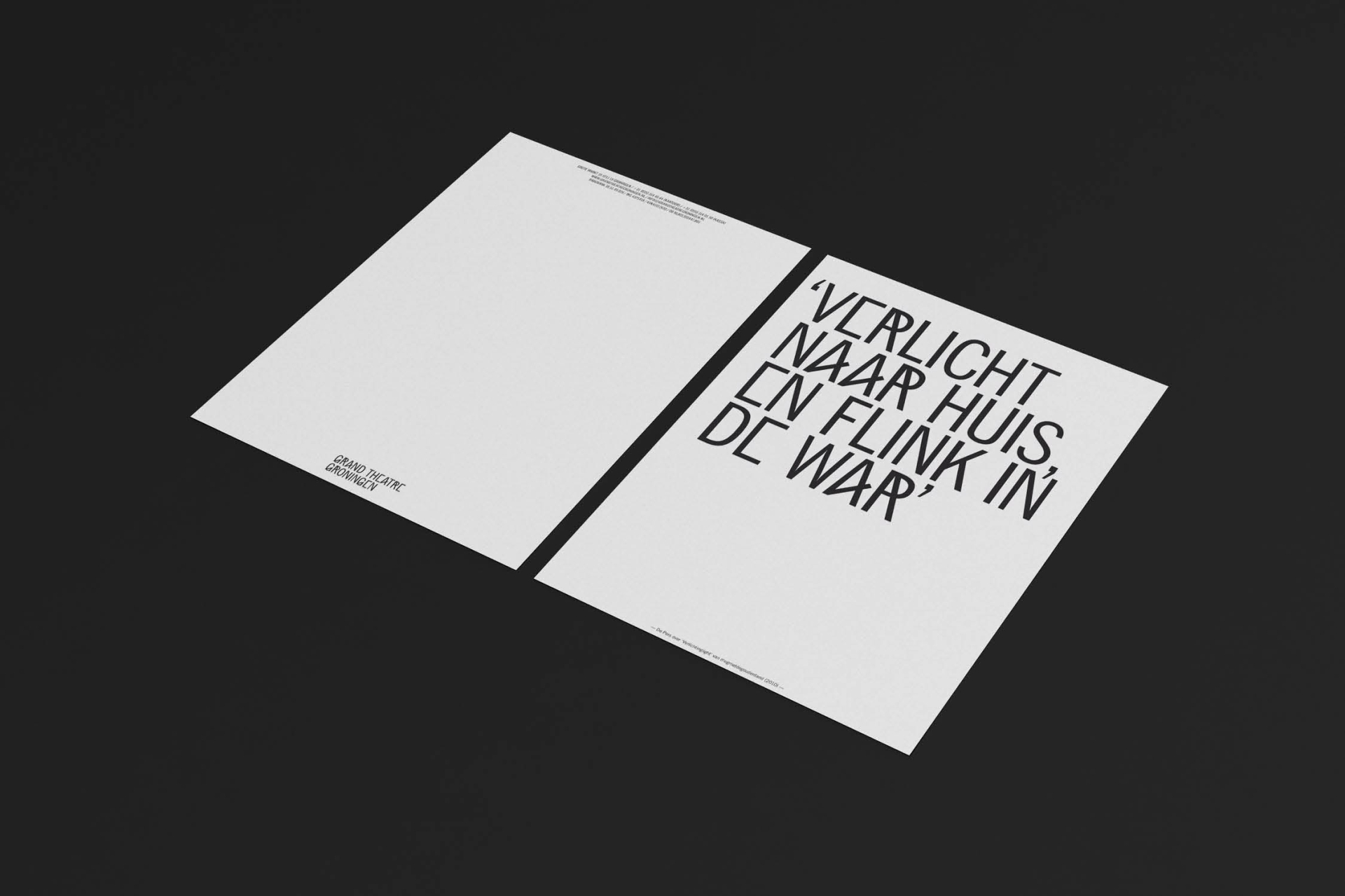 Grand Theatre Groningen is an international stage and theatre production company; avantgardistic, boldly authentic and razor-sharp. It aims to disrupt, confront and turn people’s brains on. Starting from there we developed an identity and bespoke typeface to enhance the theatre's mission. And subsequently create a unique and highly recognizable visual language and identity, which was an important goal and the outset for the assignment.