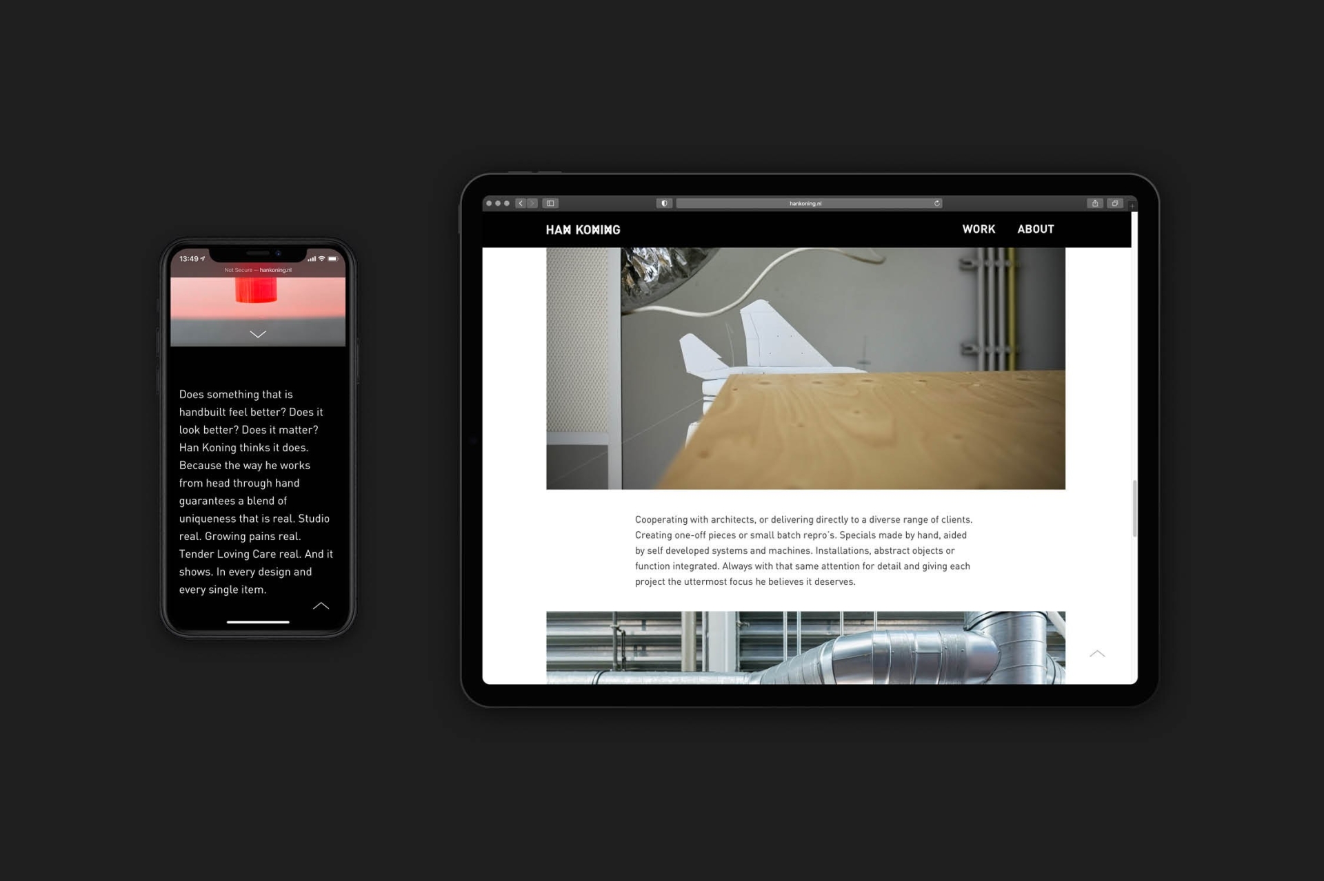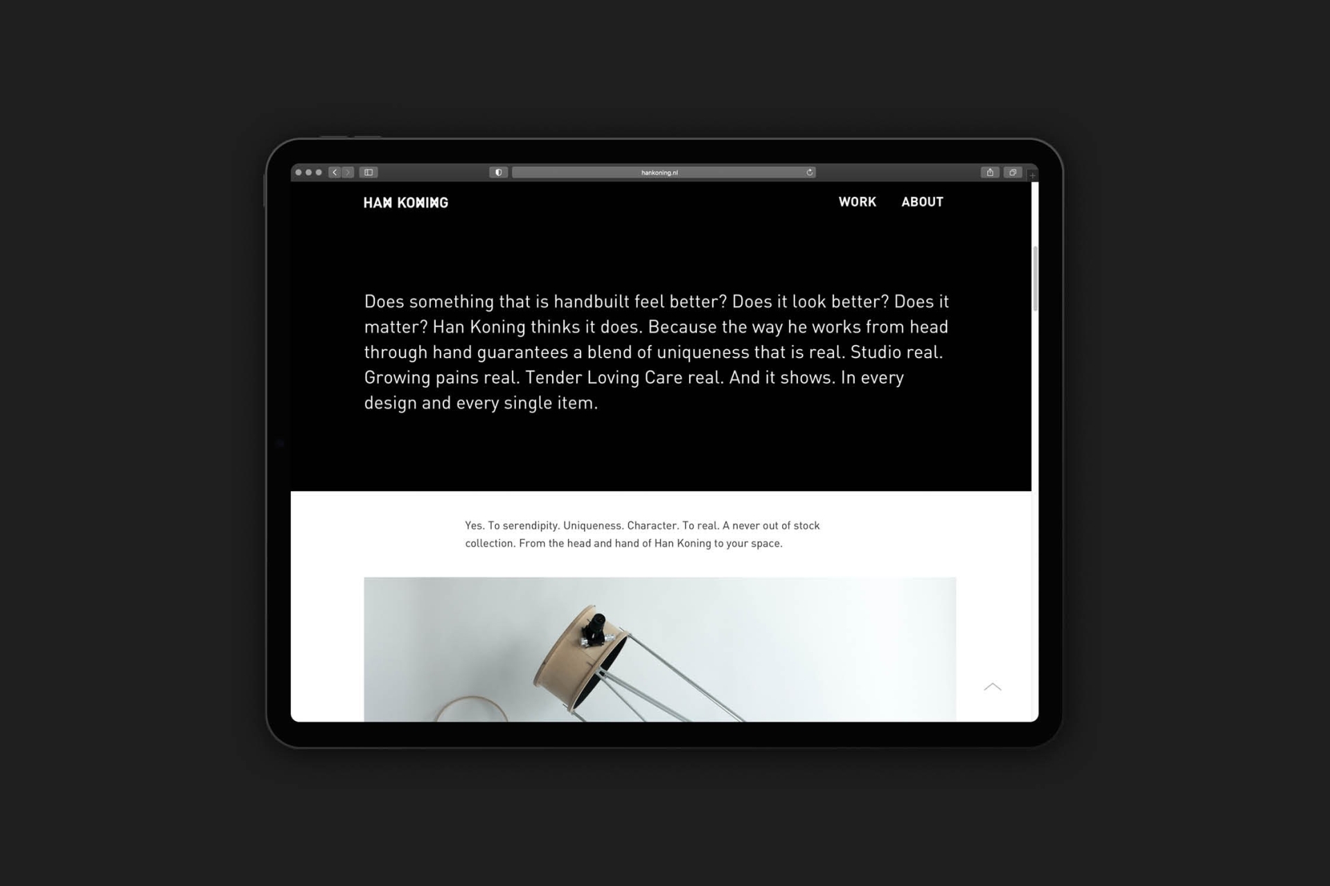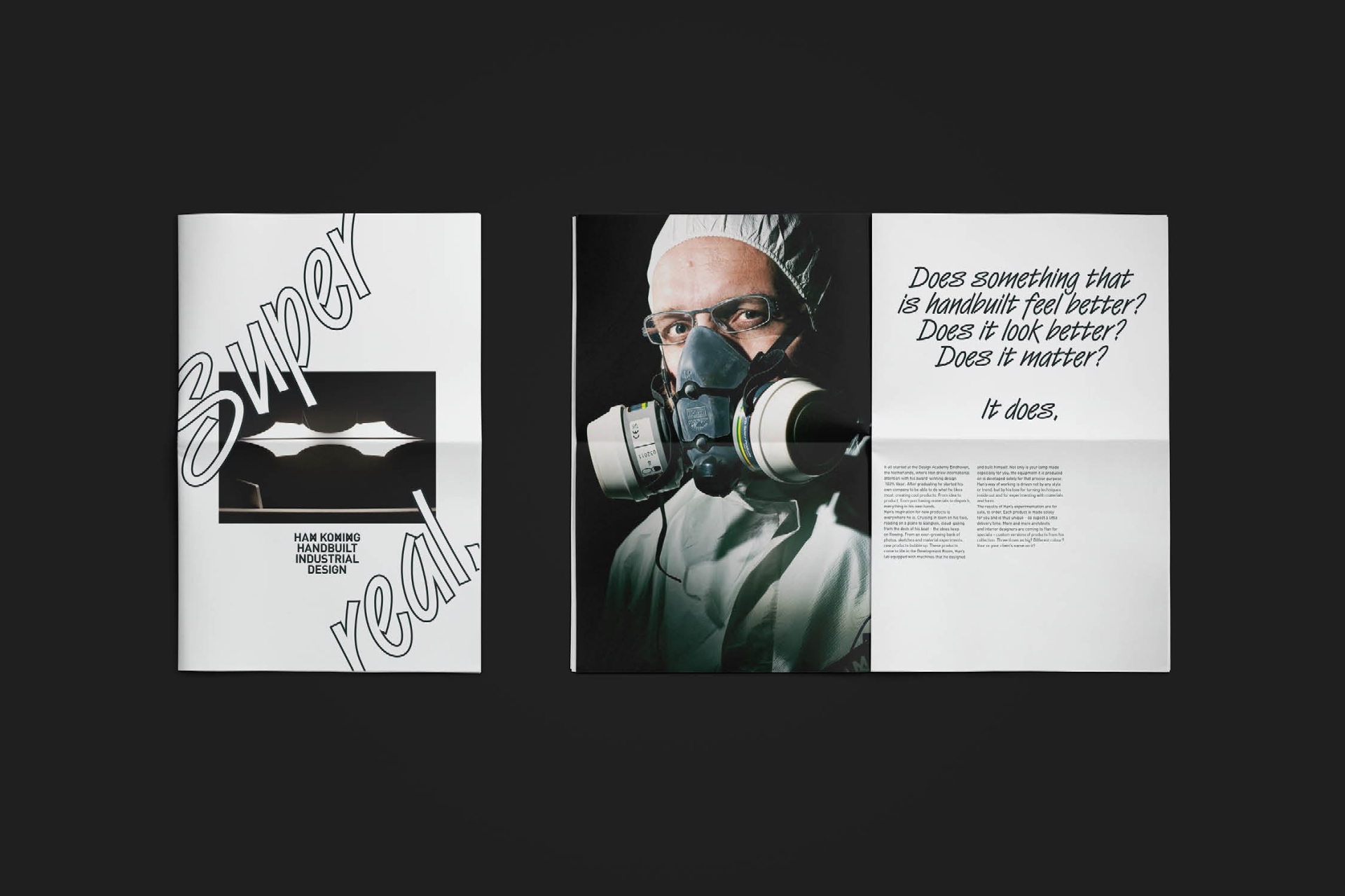 Visual identity design and art direction for Han Koning, autonomous designer. Han creates one-off pieces and small batch repro’s. Specials made by hand, aided by self developed systems and machines. The way he works from head through hand guarantees a blend of uniqueness that is real.
